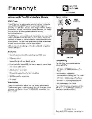 Datasheet for the Silent Knight IDP-Zone, published in 2015. Document No: 350292, Rev: G. 8 models including IDP-Zone, SMB500, IFP-2000 and 5 additional variants. Detailed technical specifications, electrical ratings, and agency listings.