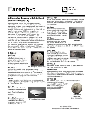 Datasheet for the Silent Knight IDP Addressable Devices, published in 2015. Document No: 350361, Rev: G. 32 models including IDP-Photo, IDP-Photo-T, IDP-Ion and 29 additional variants. Detailed technical specifications, electrical ratings, and agency listings.