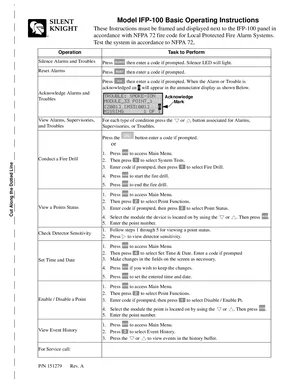 Operations Manual for the Silent Knight IFP-100. Document No: 151279, Rev: A. Model IFP-100. Daily operating procedures, alarm response guides, and system status indicators.