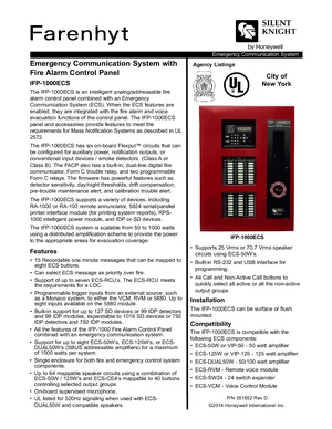 Datasheet for the Silent Knight IFP-1000ECS, published in 2014. Document No: 351552, Rev: D. 19 models including IFP-1000ECS, IFP-1000ECSHV, ECS-50W and 16 additional variants. Engineering specifications, wiring diagrams, and mounting dimensions.