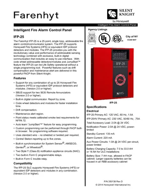 Datasheet for the Silent Knight IFP-25, published in 2014. Document No: 350138, Rev: D. 21 models including IFP-25, IFP-25HV, 5635R and 18 additional variants. Detailed technical specifications, electrical ratings, and agency listings.