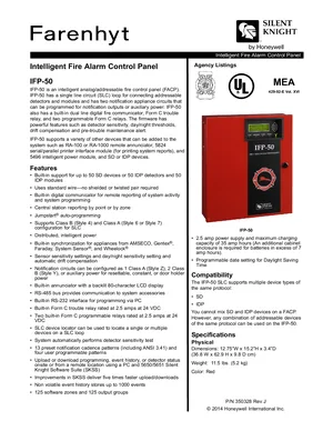 Datasheet for the Silent Knight IFP-50, published in 2014. Document No: 350328, Rev: J. 17 models including IFP-50, RA-100, RA-1000 and 14 additional variants. Detailed technical specifications, electrical ratings, and agency listings.
