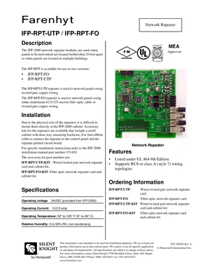 Datasheet for the Silent Knight IFP-RPT-UTP and IFP-RPT-FO. Document No: 350403, Rev: A. 5 models including IFP-RPT-UTP, IFP-RPT-FO, IFP-RPT-UTP-KIT and 2 additional variants. Product features, environmental operating limits, and compatibility data.