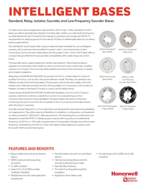 Datasheet for the Silent Knight Intelligent Bases, published in 2019. Document No: SK-61045, Rev: B. 19 models including B300-6, B300-6-IV, B300-6-BP and 16 additional variants. Engineering specifications, wiring diagrams, and mounting dimensions.