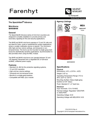 Datasheet for the Silent Knight MHR and MHW, published in 2010. Document No: 351512, Rev: A. Models MHR and MHW. Detailed technical specifications, electrical ratings, and agency listings.