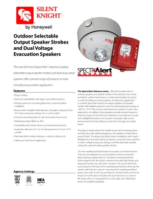 Datasheet for the Silent Knight Outdoor Speaker and Speaker Strobe, published in 2009. Document No: A05-1007-005, Rev: #2030. 10 models including SPWK, SPRK, SPSWK and 7 additional variants. Engineering specifications, wiring diagrams, and mounting dimensions.