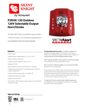 Datasheet for the Silent Knight P2RHK-120, published in 2009. Document No: A05-1007-005, Rev: #2030. Models P2RHK-120 and MP120K. Detailed technical specifications, electrical ratings, and agency listings.