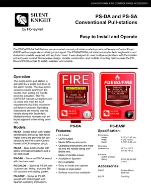 Datasheet for the Silent Knight PS-DA and PS-SA, published in 2011. Document No: 350241, Rev: D. 8 models including PS-DA, PS-SA, PS-DAH and 5 additional variants. Product features, environmental operating limits, and compatibility data.