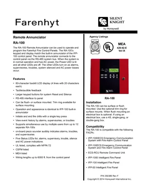 Datasheet for the Silent Knight RA-100, published in 2014. Document No: 350389, Rev: F. 8 models including RA-100, RA-100TR, IFP-1000ECS and 5 additional variants. Detailed technical specifications, electrical ratings, and agency listings.
