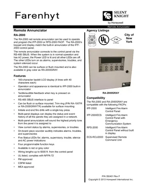 Datasheet for the Silent Knight RA-2000, published in 2013. Document No: 350401, Rev: F. 8 models including RA-2000, RA-2000GRAY, IFP-2000 and 5 additional variants. Product features, environmental operating limits, and compatibility data.
