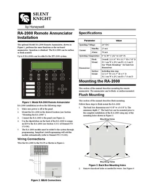 Installation Manual for the Silent Knight RA-2000, published in 2008. Document No: 151443, Rev: A. 4 models including RA-2000, RA-2000TG, RA-2000TR and 1 additional variants. Physical installation guide, backbox dimensions, and cabling specifications.