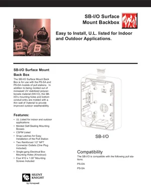 Datasheet for the Silent Knight SB-I/O, published in 2008. Document No: 350052. Models SB-I/O, PS-DA and PS-SA. Product features, environmental operating limits, and compatibility data.