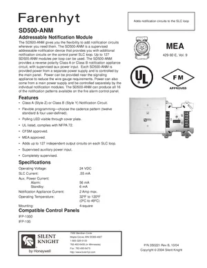 Datasheet for the Silent Knight SD500-ANM, published in 2004. Document No: 350221, Rev: B. Models SD500-ANM, IFP-1000 and IFP-100. Engineering specifications, wiring diagrams, and mounting dimensions.