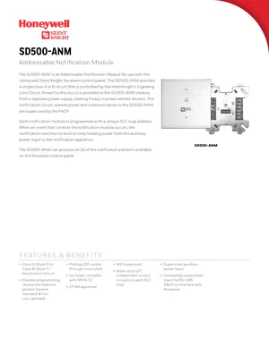 Datasheet for the Silent Knight SD500-ANM, published in 2017. Document No: 350220, Rev: F. 9 models including SD500-ANM, 6820, 6820EVS and 6 additional variants. Detailed technical specifications, electrical ratings, and agency listings.