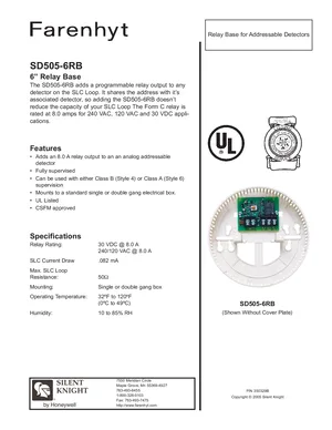 Datasheet for the Silent Knight SD505-6RB, published in 2005. Document No: 350329B, Rev: B. Models SD505-6RB and SD505-6AB. Detailed technical specifications, electrical ratings, and agency listings.