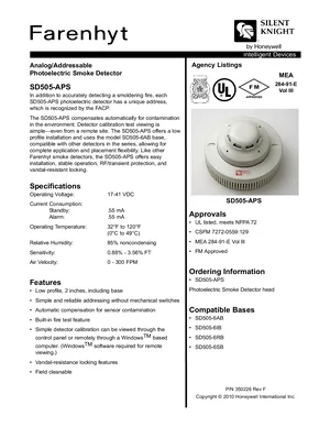 Datasheet for the Silent Knight SD505-APS, published in 2010. Document No: 350226, Rev: F. 5 models including SD505-APS, SD505-6AB, SD505-6IB and 2 additional variants. Detailed technical specifications, electrical ratings, and agency listings.