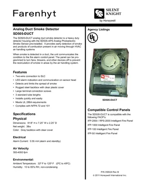 Datasheet for the Silent Knight SD505-DUCT, published in 2011. Document No: 350024, Rev: B. 10 models including SD505-DUCT, SD505-APS, IFP-2000 and 7 additional variants. Engineering specifications, wiring diagrams, and mounting dimensions.
