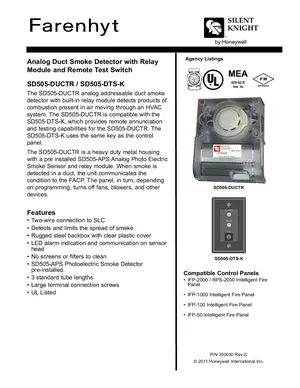 Datasheet for the Silent Knight SD505-DUCTR, published in 2011. Document No: 350030, Rev: C. 9 models including SD505-DUCTR, SD505-DTS-K, SD505-APS and 6 additional variants. Detailed technical specifications, electrical ratings, and agency listings.