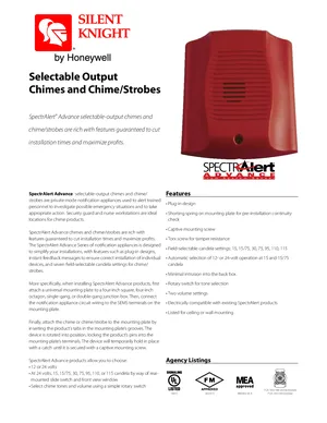 Datasheet for the Silent Knight SpectrAlert Advance Chimes, published in 2009. Document No: A05-1007-005, Rev: 2/09. 4 models including CHR, CHW, CHSR and 1 additional variants. Engineering specifications, wiring diagrams, and mounting dimensions.