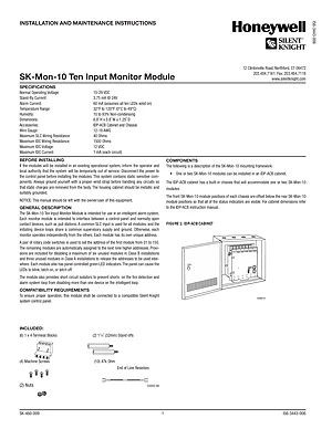 Datasheet for the Silent Knight SK-MON-10, published in 2025. Document No: I56-3443-006. Model SK-MON-10. Engineering specifications, wiring diagrams, and mounting dimensions.
