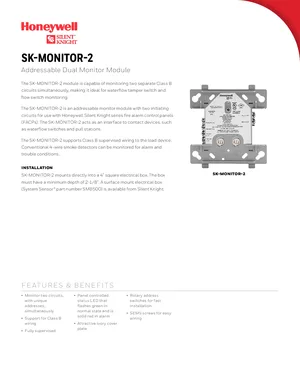 Datasheet for the Silent Knight SK-MONITOR-2, published in 2017. Document No: 350124, Rev: E. 10 models including SK-MONITOR-2, SMB500, 6820 and 7 additional variants. Product features, environmental operating limits, and compatibility data.