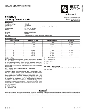 Installation Manual for the Silent Knight SK-Relay-6, published in 2025. Document No: I56-3439-007. Model SK-Relay-6. Mounting instructions, wiring diagrams, and system power-up procedures.