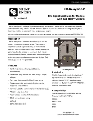 Datasheet for the Silent Knight SK-Relaymon-2, published in 2015. Document No: 350755, Rev: D. 6 models including SK-Relaymon-2, 5820XL, 5820XL-EVS and 3 additional variants. Engineering specifications, wiring diagrams, and mounting dimensions.