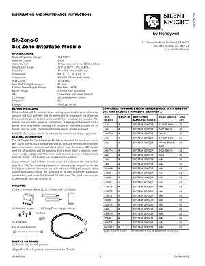 Datasheet for the Silent Knight SK-Zone-6, published in 2009. Document No: I56-3441-002. Model SK-Zone-6. Product features, environmental operating limits, and compatibility data.