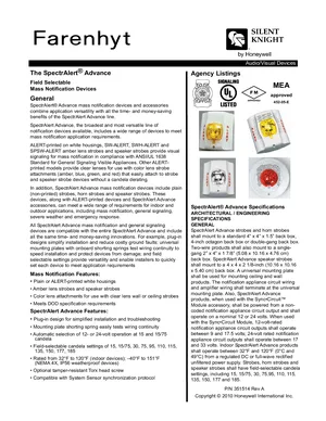 Datasheet for the Silent Knight SpectrAlert Advance, published in 2010. Document No: 351514, Rev: A. 38 models including SW-ALERT, SWH-ALERT, SPSW-ALERT and 35 additional variants. Detailed technical specifications, electrical ratings, and agency listings.
