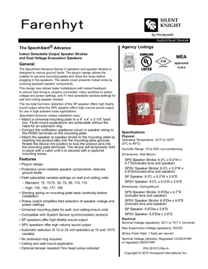 Datasheet for the Silent Knight SpectrAlert Advance Speakers, published in 2010. Document No: 351513, Rev: A. 18 models including SP, SPV, SPS and 15 additional variants. Detailed technical specifications, electrical ratings, and agency listings.