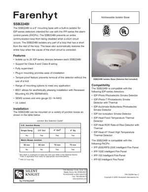 Datasheet for the Silent Knight SSB224BI Isolator Base, published in 2009. Document No: 350298, Rev: C. 20 models including SSB224BI, IDP-Photo, IDP-Photo-T and 17 additional variants. Detailed technical specifications, electrical ratings, and agency listings.