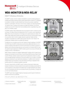 Datasheet for the Silent Knight WSK-MONITOR and WSK-RELAY, published in 2018. Document No: 351616, Rev: B. 18 models including WSK-MONITOR, WSK-RELAY, WSK-WGI and 15 additional variants. Detailed technical specifications, electrical ratings, and agency listings.