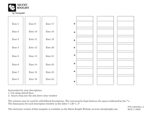 Manual for the Silent Knight Zone Description Template, published in 2011. Document No: 54422, Rev: A. Capabilities, specifications summary, and usage notes.