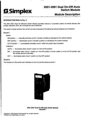 Datasheet for the Simplex 2001-2091 Dual On-Off-Auto Switch Module, published in 1984. Document No: 575-958, Rev: Ed 8 84. Model 2001-2091. Detailed technical specifications, electrical ratings, and agency listings.