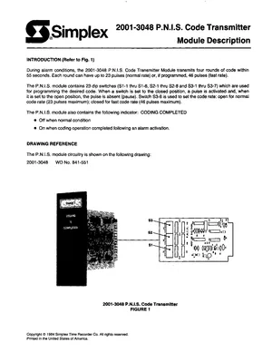 Datasheet for the Simplex 2001-3048 P.N.I.S. Code Transmitter, published in 1984. Document No: 575-964, Rev: Ed 10 84. Model 2001-3048. Product features, environmental operating limits, and compatibility data.