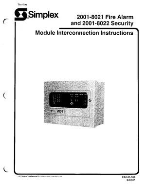 Manual for the Simplex 2001-8021 & 2001-8022 Module Interconnection Instructions, published in 1987. Document No: FA2-21-100, Rev: Ed 2 87. 37 models including 2001-8021, 2001-8022, 2001-1007 and 34 additional variants. Capabilities, specifications summary, and usage notes.