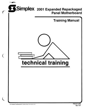 Manual for the Simplex 2001 Expanded Repackaged Training Manual, published in 1987. Document No: FA2-91-008, Rev: Ed 7 87. 8 models including 2001, 1007, 1017 and 5 additional variants. System overview, features and capabilities, and basic operation.