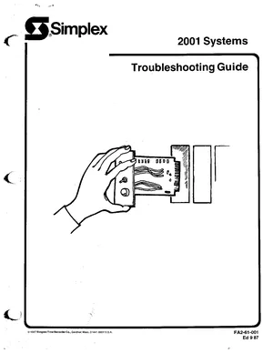 Manual for the Simplex 2001 Systems Troubleshooting Guide, published in 1987. Document No: FA2-61-001, Rev: Ed 9 87. 171 models including 2001, 2001-8021, 2001-8023 and 168 additional variants. Capabilities, specifications summary, and usage notes.