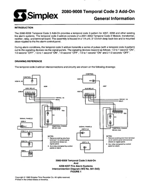 Datasheet for the Simplex 2080-9008 Temporal Code 3 Add-On, published in 1985. Document No: 575-965, Rev: 1. 19 models including 2080-9008, 2001-3053, 4207 and 16 additional variants. Detailed technical specifications, electrical ratings, and agency listings.