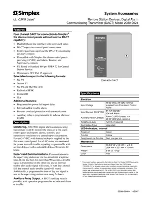 Datasheet for the Simplex 2080-9024 DACT, published in 2007. Document No: S2080-0008-4, Rev: 4. 5 models including 2080-9024, 2080-9022, 5230 and 2 additional variants. Detailed technical specifications, electrical ratings, and agency listings.