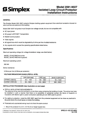 Installation Manual for the Simplex 2081-9027, published in 1996. Document No: SPEC-21-102 (574-803), Rev: Ed 4 96. Model 2081-9027. Mounting instructions, wiring diagrams, and system power-up procedures.