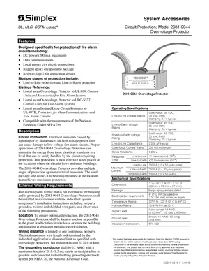 Datasheet for the Simplex 2081-9044 Overvoltage Protector, published in 2013. Document No: S2081-0016-3, Rev: 3. 16 models including 2081-9044, 4090-9101, 4090-9106 and 13 additional variants. Detailed technical specifications, electrical ratings, and agency listings.