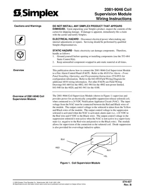 Installation Manual for the Simplex 2081-9046, published in 2000. Document No: 574-437, Rev: B. 5 models including 2081-9046, 4010, 4002 and 2 additional variants. Mounting instructions, wiring diagrams, and system power-up procedures.