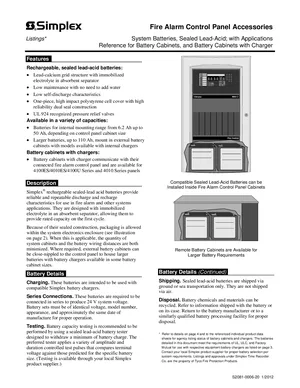 Datasheet for the Simplex System Batteries, published in 2012. Document No: S2081-0006-20, Rev: 20. 9 models including 2081-9272, 2081-9274, 2081-9288 and 6 additional variants. Detailed technical specifications, electrical ratings, and agency listings.