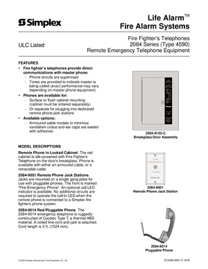 Datasheet for the Simplex 2084 Series Fire Fighter Telephones, published in 2000. Document No: S12084-0001-5, Rev: 5. 7 models including 2084-9001, 2084-9014, 2084-9103-C and 4 additional variants. Engineering specifications, wiring diagrams, and mounting dimensions.