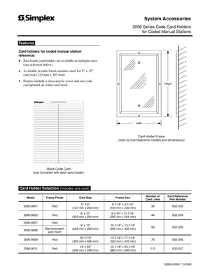 Datasheet for the Simplex 2096 Series Code Card Holders, published in 2009. Document No: S2096-0005-7, Rev: 7. 6 models including 2096-9801, 2096-9805, 2096-9807 and 3 additional variants. Product features, environmental operating limits, and compatibility data.