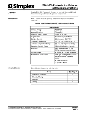 Installation Manual for the Simplex 2098-9209, published in 2000. Document No: 574-667, Rev: A. Model 2098-9209. Physical installation guide, backbox dimensions, and cabling specifications.