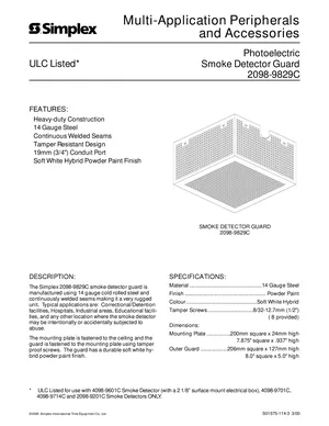Datasheet for the Simplex 2098-9829C Detector Guard, published in 2000. Document No: S01575-114-3, Rev: 3. 5 models including 2098-9829C, 4098-9601C, 4098-9701C and 2 additional variants. Engineering specifications, wiring diagrams, and mounting dimensions.
