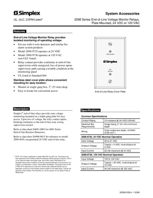 Datasheet for the Simplex 2098 Series EOL Relays, published in 2008. Document No: S2098-0029, Rev: 4. Models 2098-9735, 2098-9736 and 2098-9839. Detailed technical specifications, electrical ratings, and agency listings.