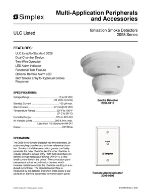 Datasheet for the Simplex 2098 Series Ionisation Smoke Detectors, published in 2000. Document No: S12098-0035-3, Rev: 3. Models 2098-9110 and 2098-9808. Detailed technical specifications, electrical ratings, and agency listings.